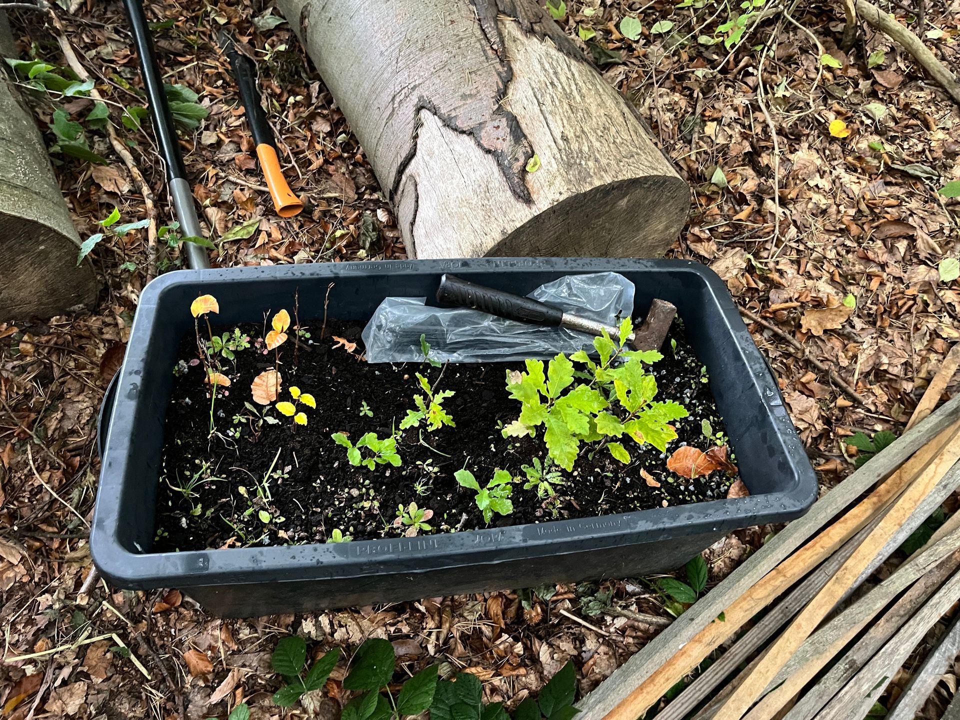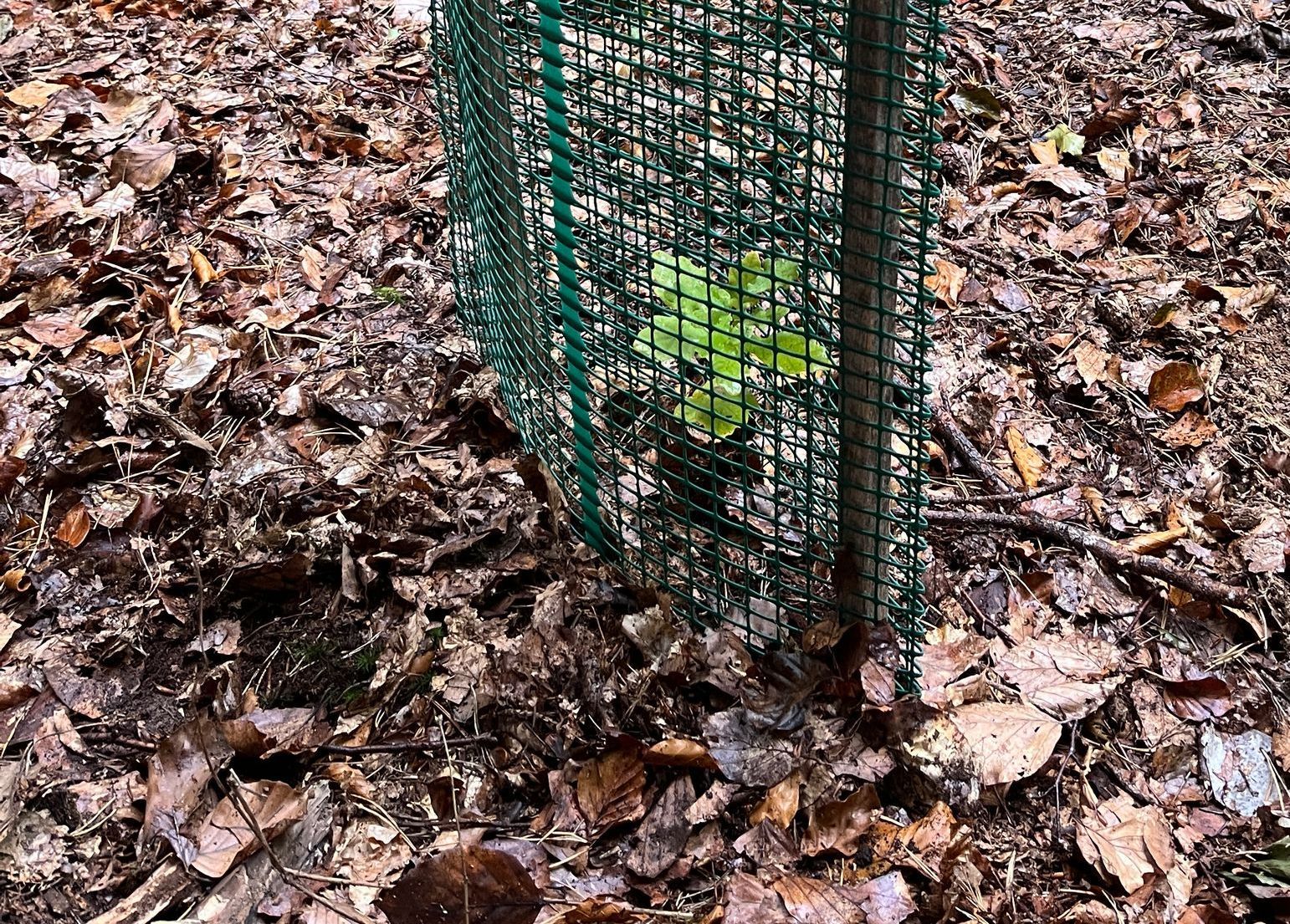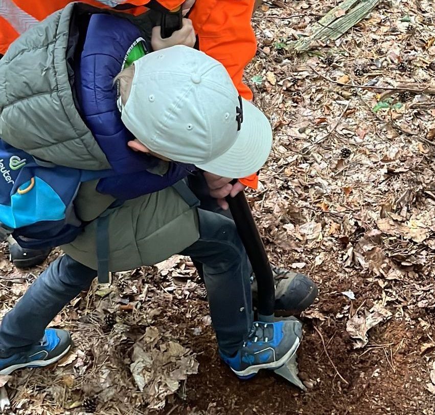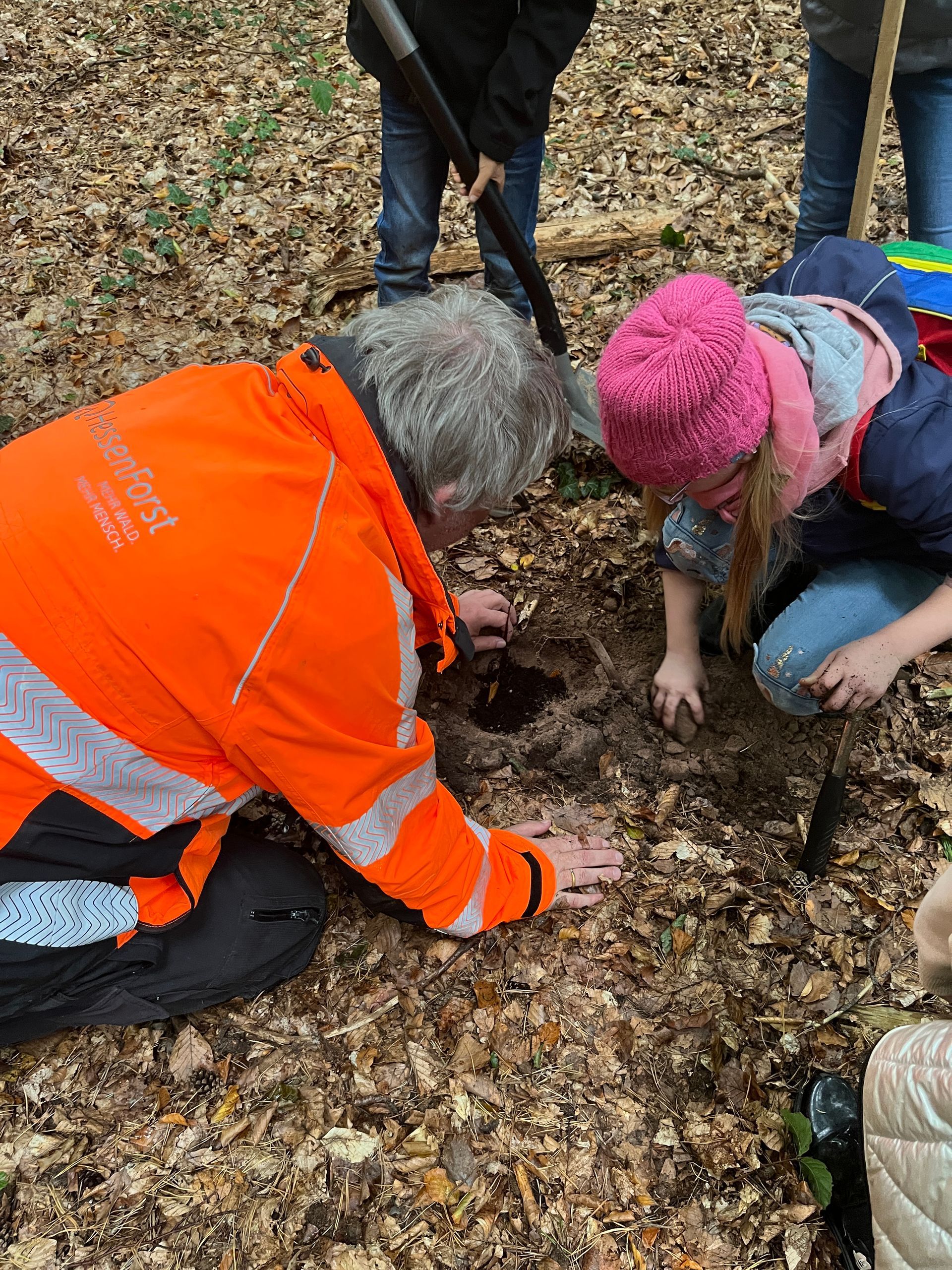 Der Jahrgang 3 war den ganzen Vormittag mit dem Förster Herrn Bauer und seinem Praktikanten Herrn Hensel im Peterswald unterwegs, um die selbst gezogenen Eichen und Buchen einzupflanzen. Hierfür wurden am Umwelttag des vergangenen Jahres Eicheln und Bucheckern gesammelt, zum Keimen gebracht und in eine Pflanzenwanne gesetzt, so dass diese Pfahlwurzeln bilden konnten. Es entstanden sechs Eichen und sechs Buchen, die auf Empfehlung des Försters an einem nicht so bewachsenen Teil des Peterwaldes (in der Nähe der Solaranlage) eingepflanzt wurden, damit sie genug Licht bekommen. Alle Kinder waren dann auch damit beschäftigt, Baumschutzhüllen für die noch jungen Pflanzen als Schutzmaßnahme vor Wildbiss, sog. Verbissschutz, zu bauen.