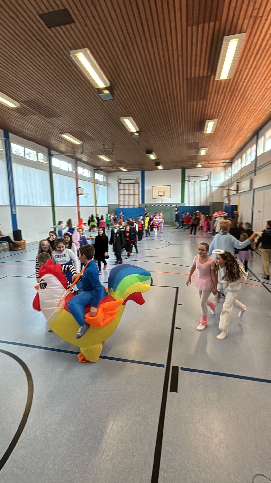 Am Rosenmontag fand in allen Klassen eine große Faschingsfeier statt. Morgens auf dem Schulhof sah man schon kunterbunte Farben, Hähne, Zauberer, Hexen, Bananen und viele weitere tolle Kostüme. Die Kinder und Lehrkräfte ließen sich tolle Kostüme einfallen und konnten diese zunächst in den Klassen präsentieren. Zur Feier des Tages hatte jede Klasse ein eigenes Faschingsbuffet organisiert, über welches die Kinder mit Freude herfielen. In der 4. Schulstunde fand mit der gesamten Schule eine große Faschingspolonaise statt, die von Frau Decher-Balogh im Musikunterricht erprobt und organisiert wurde. Hier hatten die Kinder die Möglichkeit, die Kostüme der anderen zu bestaunen.
