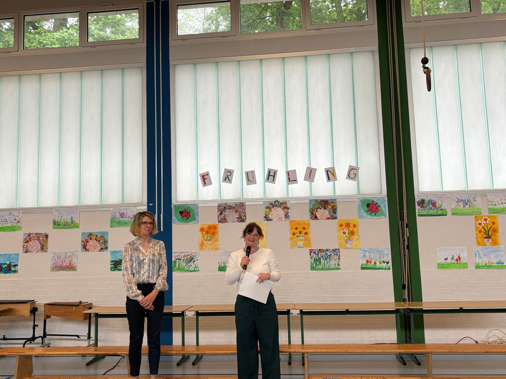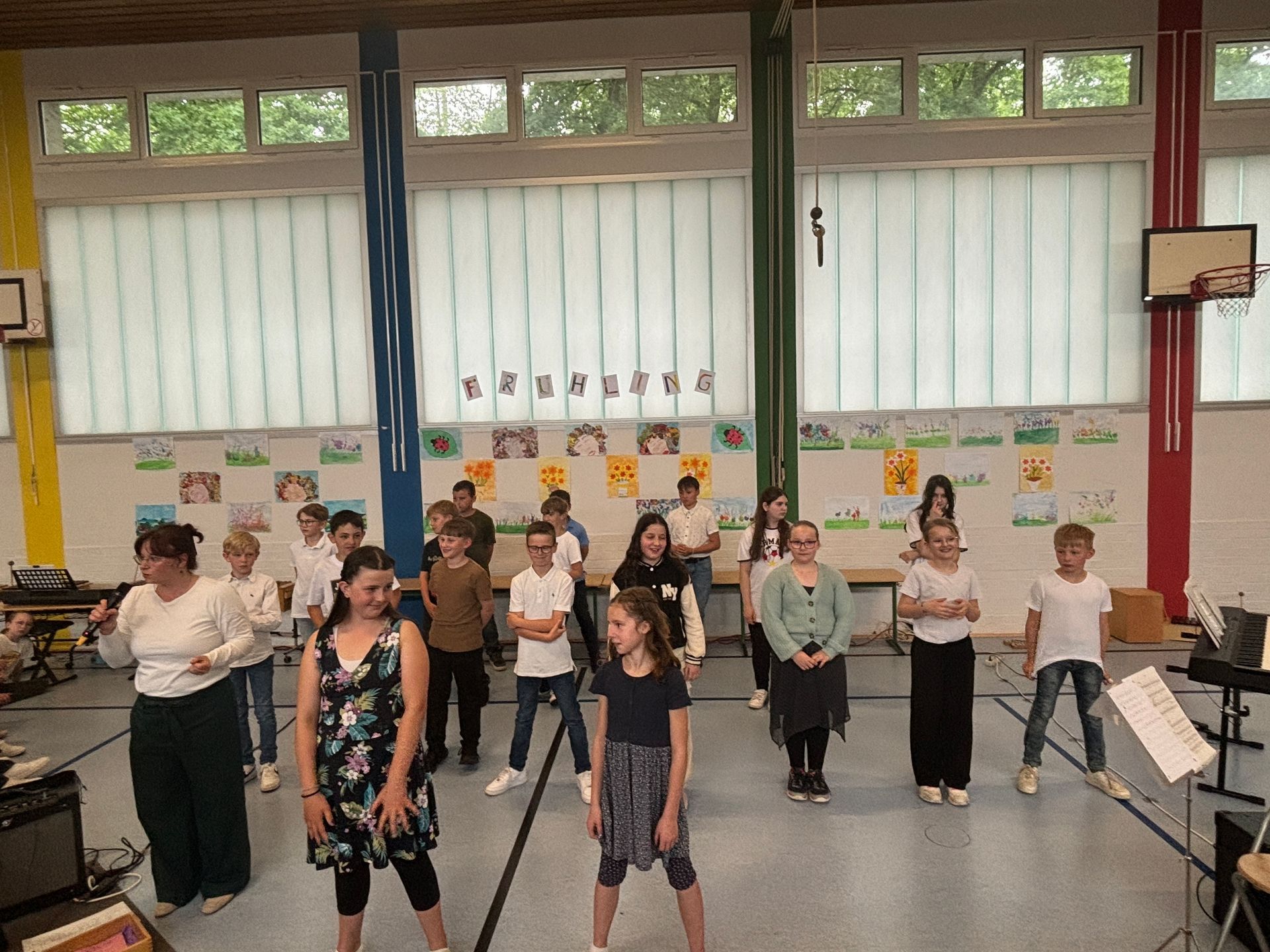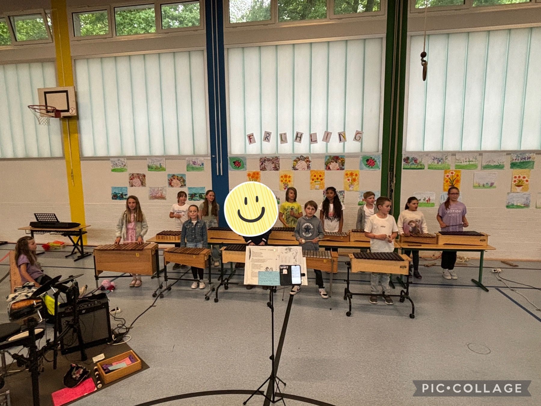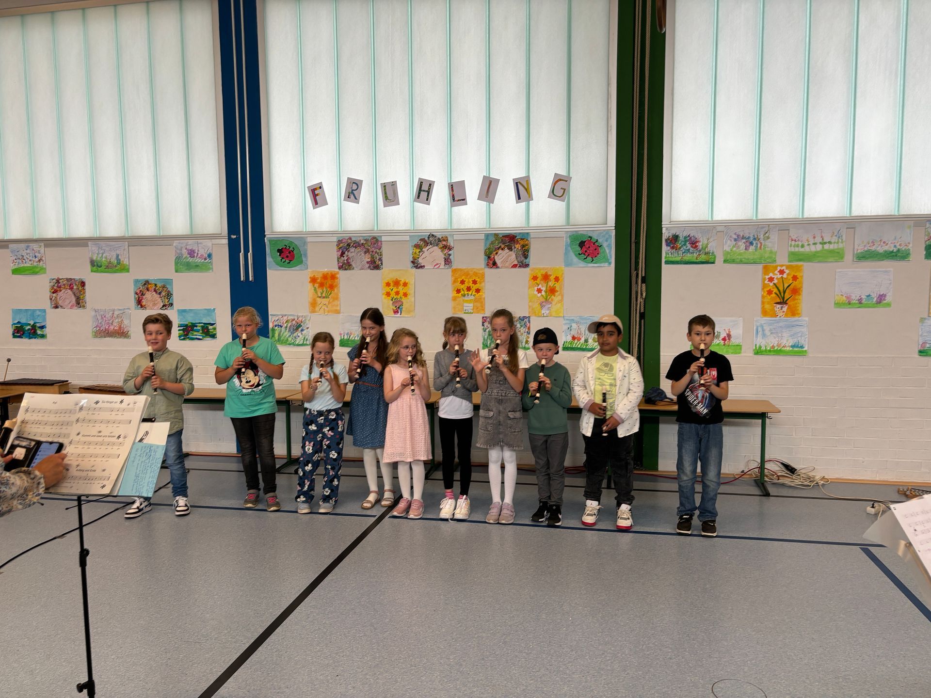 Am Freitagnachmittag, den 24.05.2024, fand unser alljährliches Frühlingskonzert statt. Vor bunt geschmückter Kulisse und vielen Zuschauenden war ein vielfältiges Programm zu erwarten. Jede Klasse leistete ihren eigenen Beitrag, aber auch der Chor, die Flöten-AGs, die Zumba-AG, die Musical-AG und die Trommel-AG hatten die Möglichkeit, sich zu präsentieren. Den Anfang machte die Flöten AG der Klasse 4, die bei ihrem 2. Lied von der 1. Klasse zum Stück „Im Märzen der Bauer“ begleitet wurde. Anschließend präsentierte Klasse 1 ein Bewegungslied, bei dem alle fröhlich mitmachten. Die Flöten AG der Klasse 2 zeigte den Zuschauenden, dass sie Pausenzeiten einhalten kann. Klasse 4 glänzte mit dem Stück „Fly like an eagle“, wo sie gekonnt Trommeln und Gesang kombinierten. Außerdem schafften sie es, alle Zuschauenden mitzunehmen und im Echo singen zu lassen. Zum Abschluss ihres Auftritts zeigten sie einen eigenen Tanz zum Lied „Komet“. Auch der Chor von Klasse 2/3 konnte mit dem Lied “Der Tierzoo” zum Mitmachen animieren.
