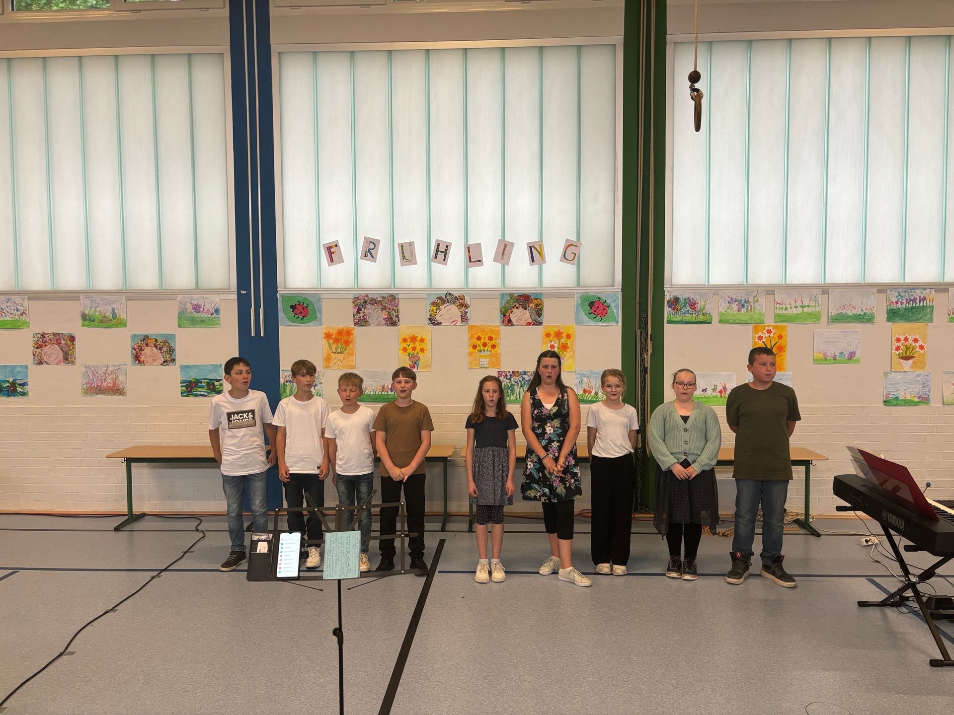 Der Chor der Klasse 4 sang „The River is Flowing“, „Menschenkinder“ und „Kalle Oberick“ mit einem tollen, mutigen Solo.