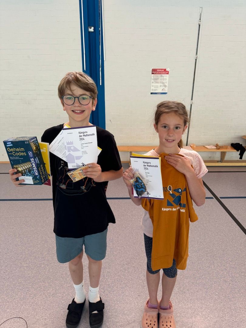 Laurenz Rinninsland (Klasse 4) erreichte viele Punkte und erhielt als insgesamt Drittplazierter einen Preis. Das Känguru-T-Shirt in orange für den weitesten Sprung erhielt Nele Völker (Klasse 4),. Sie hat die meisten Aufgaben in Folge gelöst. Herzlichen Glückwunsch sagen wir diesen besonderen Gewinnern.